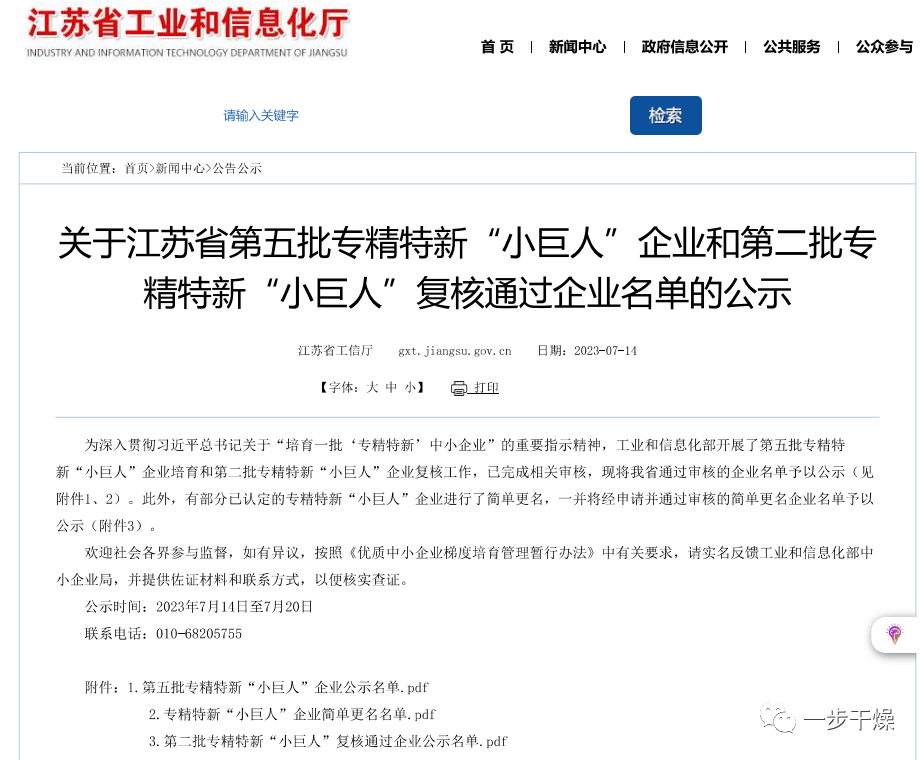 近日,工業(yè)和信息化部發(fā)布了第五批國(guó)家專精特新“小巨人”企業(yè)公示名單,常州一步干燥設(shè)備有限公司榜上有名。
