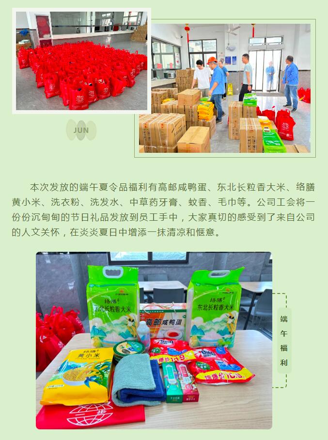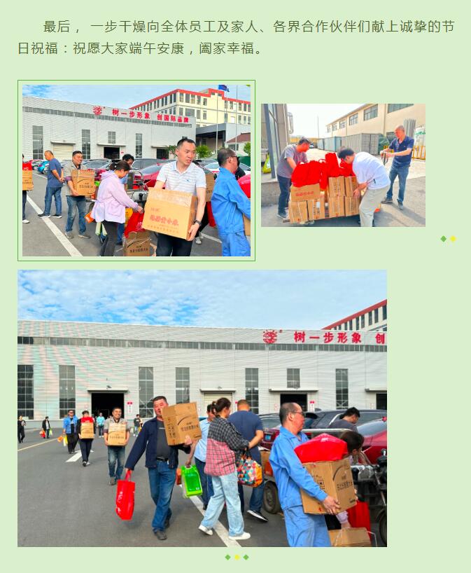 一年一端午,一歲一安康。端午節(jié)是中華民族傳統(tǒng)節(jié)日,為弘揚(yáng)傳統(tǒng)優(yōu)秀文化,增強(qiáng)員工幸福感、歸屬感,常州一步干燥設(shè)備有限公司在端午節(jié)為全體員工發(fā)放端午夏令品福利,并送上節(jié)日的祝福,讓大家度過(guò)一個(gè)暖心、祥和的端午佳節(jié)。