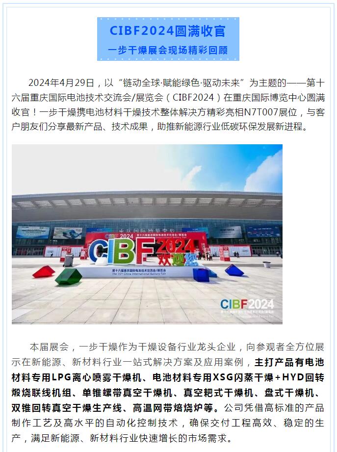 2024年4月29日,以“鏈動全球·賦能綠色·驅(qū)動未來”為主題的——第十六屆重慶國際電池技術(shù)交流會/展覽會(CIBF2024)在重慶國際博覽中心圓滿收官!一步干燥攜電池材料干燥技術(shù)整體解決方精彩亮相N7T007展位,與客戶朋友們分享最新產(chǎn)品、技術(shù)成果,助推新能源行業(yè)低碳環(huán)保發(fā)展新進程。