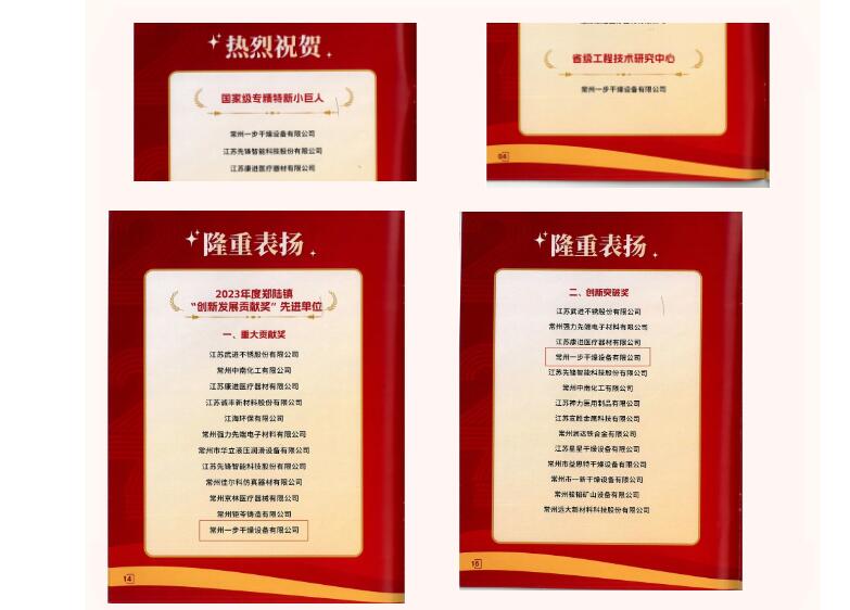 大會(huì)宣讀了高新區(qū)(鄭陸鎮(zhèn))2023年獲市級(jí)以上榮譽(yù)的企業(yè)和單位名單,表彰了2023年度鄭陸鎮(zhèn)“創(chuàng)新發(fā)展貢獻(xiàn)獎(jiǎng)”先進(jìn)單位。常州一步干燥設(shè)備有限公司憑借出色的企業(yè)創(chuàng)新能力榮登“光榮榜”,被授予2023年度“創(chuàng)新突破獎(jiǎng)”、“重大貢獻(xiàn)獎(jiǎng)”等多項(xiàng)榮譽(yù)。