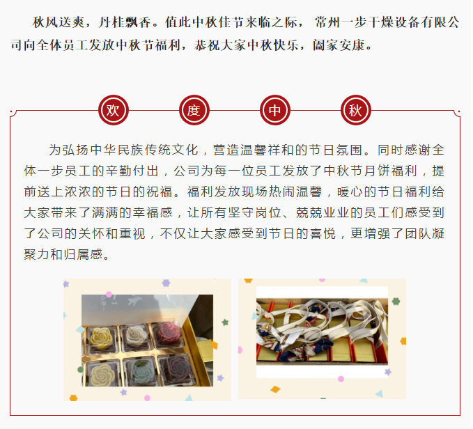 秋風(fēng)送爽,丹桂飄香。值此中秋佳節(jié)來(lái)臨之際, 常州一步干燥設(shè)備有限公司向全體員工發(fā)放中秋節(jié)福利,恭祝大家中秋快樂(lè),闔家安康。