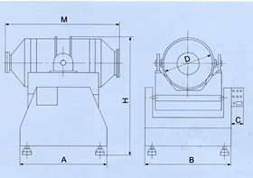 二維混料機(jī)主要由轉(zhuǎn)筒、擺動(dòng)架、機(jī)架三大部分構(gòu)成。轉(zhuǎn)筒裝在擺動(dòng)架上,由四個(gè)滾輪支撐并由兩個(gè)擋輪對(duì)其進(jìn)行軸向定位,在四個(gè)支撐滾輪中,其中兩個(gè)傳動(dòng)輪由轉(zhuǎn)動(dòng)動(dòng)力系統(tǒng)拖動(dòng)使轉(zhuǎn)筒產(chǎn)生轉(zhuǎn)動(dòng),擺動(dòng)架由一組曲柄擺桿機(jī)構(gòu)來驅(qū)動(dòng),曲柄擺桿機(jī)構(gòu)在機(jī)架上,擺動(dòng)架由軸承組件支撐在機(jī)架上。