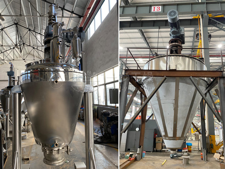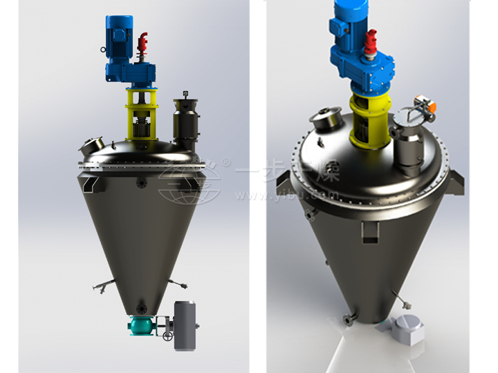 1、該設備工作過程為間歇批操作,濕物料進入料倉后,通過筒壁夾套和螺旋槳內部給熱,使給熱面積達到整個容器面積的130%,對物料進行升溫干燥。并選擇相應的錐型干燥混合器型號(工作容積)達到理想的干燥效果。采用上驅式結構的混合干燥機具有高效干燥、混合能力的同時,具有空間充裕,更便于使用者進行檢修維護的特點。