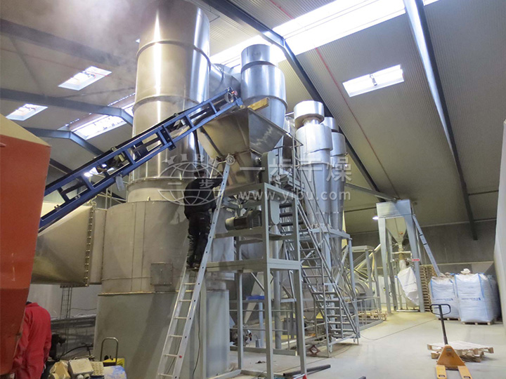 閃蒸干燥機(jī)主要由進(jìn)風(fēng)系統(tǒng)、加熱系統(tǒng)、加料系統(tǒng)、干燥主機(jī)、收料除塵系統(tǒng)、排風(fēng)系統(tǒng)、控制系統(tǒng)等組成。工作時(shí),濕物料由螺旋加料器進(jìn)入干燥室,物料在干燥室中與高速旋轉(zhuǎn)的熱風(fēng)相遇,細(xì)粉狀物料被熱風(fēng)帶著向干燥室上端移動(dòng),不能帶走的物料落在干燥室底部,被底部的粉碎裝置打碎,物料被迅速分散,物料與熱風(fēng)的接觸面積迅速增大。在離心力的作用下(頂部有分級裝置),達(dá)到干燥程度和一定細(xì)度的產(chǎn)品被吹出分級裝置,物料在此過程中得到快速干燥。