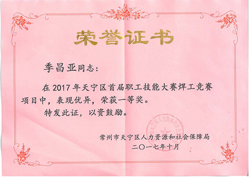 我公司一線技術(shù)能手踴躍報名參加競賽,并且不負(fù)眾望,在60多名參賽選手中脫穎而出,其中季昌亞榮同志榮獲“2017天寧區(qū)首屆職工技能大賽焊工競賽項目”一等獎,被授予“天寧區(qū)崗位操作能手”榮譽(yù)稱號,金錫松同志和陳志偉同志分別榮獲優(yōu)勝獎,展現(xiàn)了一步職工過硬的專業(yè)技能水平和精彩的競技風(fēng)采。